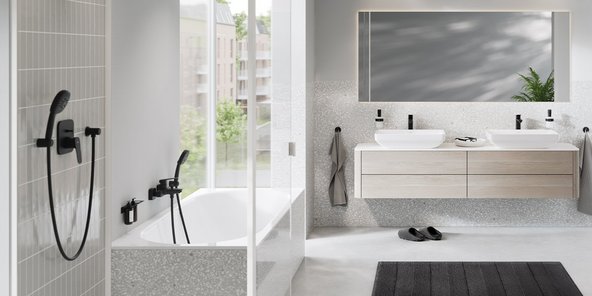 GROHE Cubeo im modernen und zugleich zeitlosen Matt Black – eine gegen Korrosion, Verblassen und Kratzer beständige Pulverbeschichtung – harmoniert mit der bräunlichen Nuance Rubber, dunkleren Hölzern wie Walnuss oder braun getönter Eiche und hellen Fliesen. Zum raffinierten, kontrastreichen Ambiente passen Accessoires aus Naturfasern oder mit auffälligen Mustern.